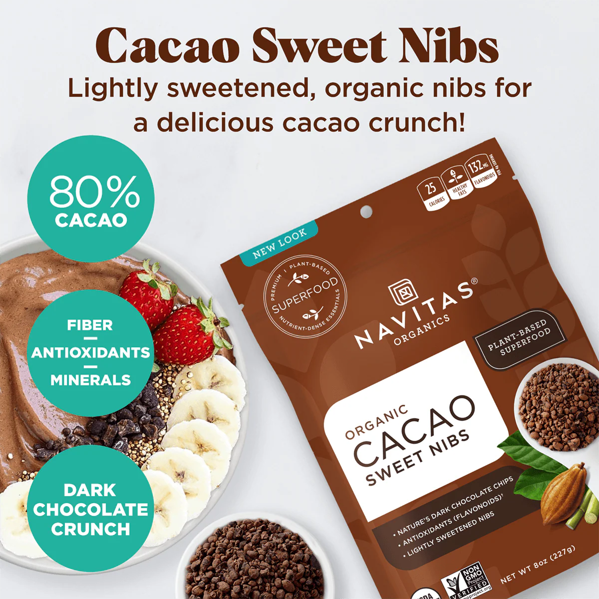 Navitas Organics Cacao Sweet Nibs are our best-selling cacao nibs rolled in just a touch of organic cane sugar. This dark chocolate, superfood nib is great for baking, smoothies, yogurt or hot cereal—or devoured straight from the bag! For a less sweet option, try our Cacao Nibs!