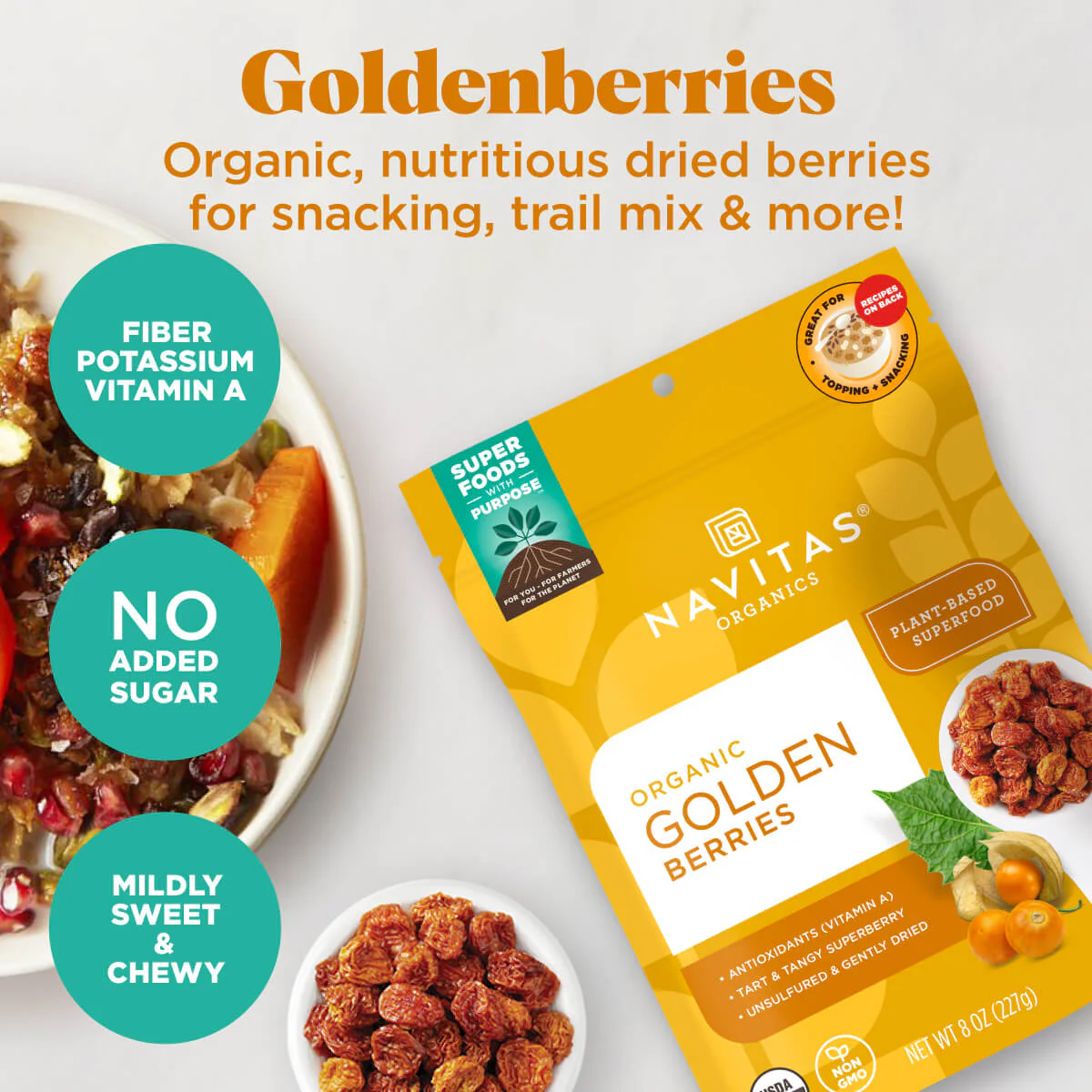 Sweet, tart and unexpectedly addictive, goldenberries are our go-to dried fruit for a bright burst of antioxidants, minerals and fiber. They're an easy, nutritious snack and add a pop of sunshine to a variety of recipes. A superfruit secret...if you know, you know!